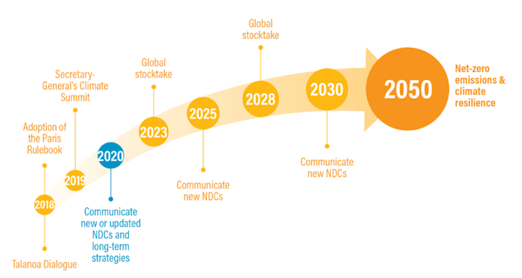 2025 marque donc, selon le calendrier décidé lors de la signature de l’accord de Paris, le début d’un nouveau cycle de cinq ans, où les pays doivent soumettre une version révisée (la troisième version) de leurs CDN, avec des plans d’action détaillés à l’horizon 2035. L’accord de Paris prévoit que cette révision quinquennale aille chaque fois vers davantage d’ambition, selon un principe dit de progression clairement affiché dans l’article 4 alinéa 3 de l’accord.