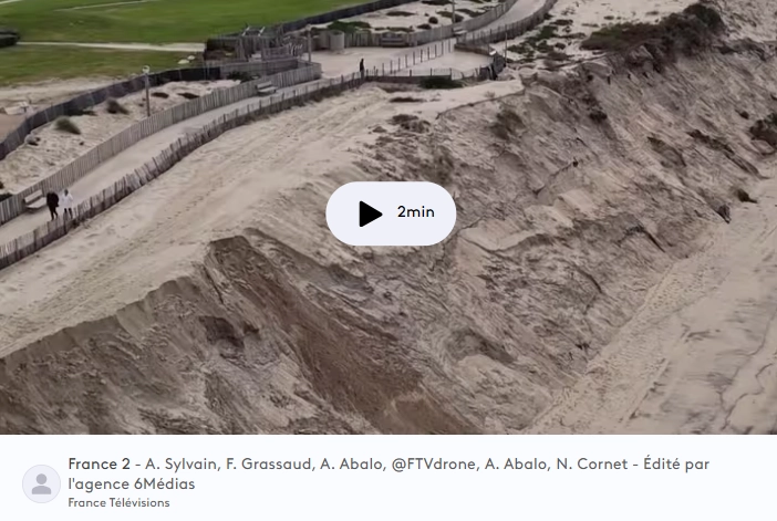 Biscarrosse, plus que jamais menacé par l'érosion(Nouvelle fenêtre). Avec les fortes marées et la houle de ces dernières semaines, la dune s'effondre, créant ces falaises de sable particulièrement dangereuses. "Il y a des gens qui sont imprudents déjà, qui descendent alors qu'ils ne devraient pas" déplore une riveraine.