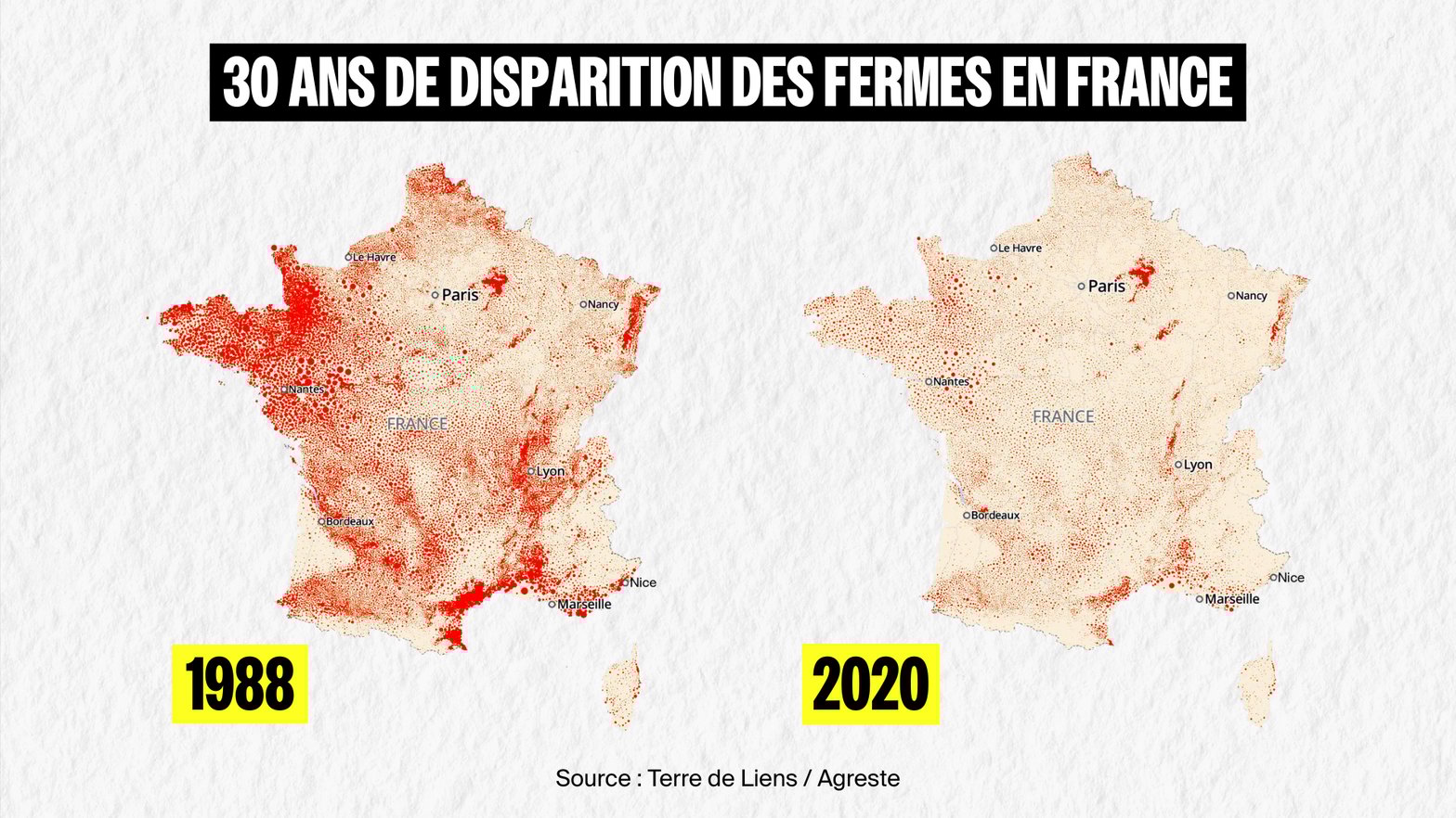 C’est une hécatombe silencieuse. Entre 1988 et 2020, 90 % des départements français ont perdu plus de la moitié de leurs fermes. Ce constat sans appel a été publié par l’association Terre de Liens, à partir de données d’Agreste, le service statistique du ministère de l’Agriculture. Cette cartographie dresse un tableau alarmant de trente ans d’évolution agricole, commune par commune. Elle révèle notamment qu’au cours des trois dernières années de la période étudiée, près de 40 000 petites exploitations ont disparu.